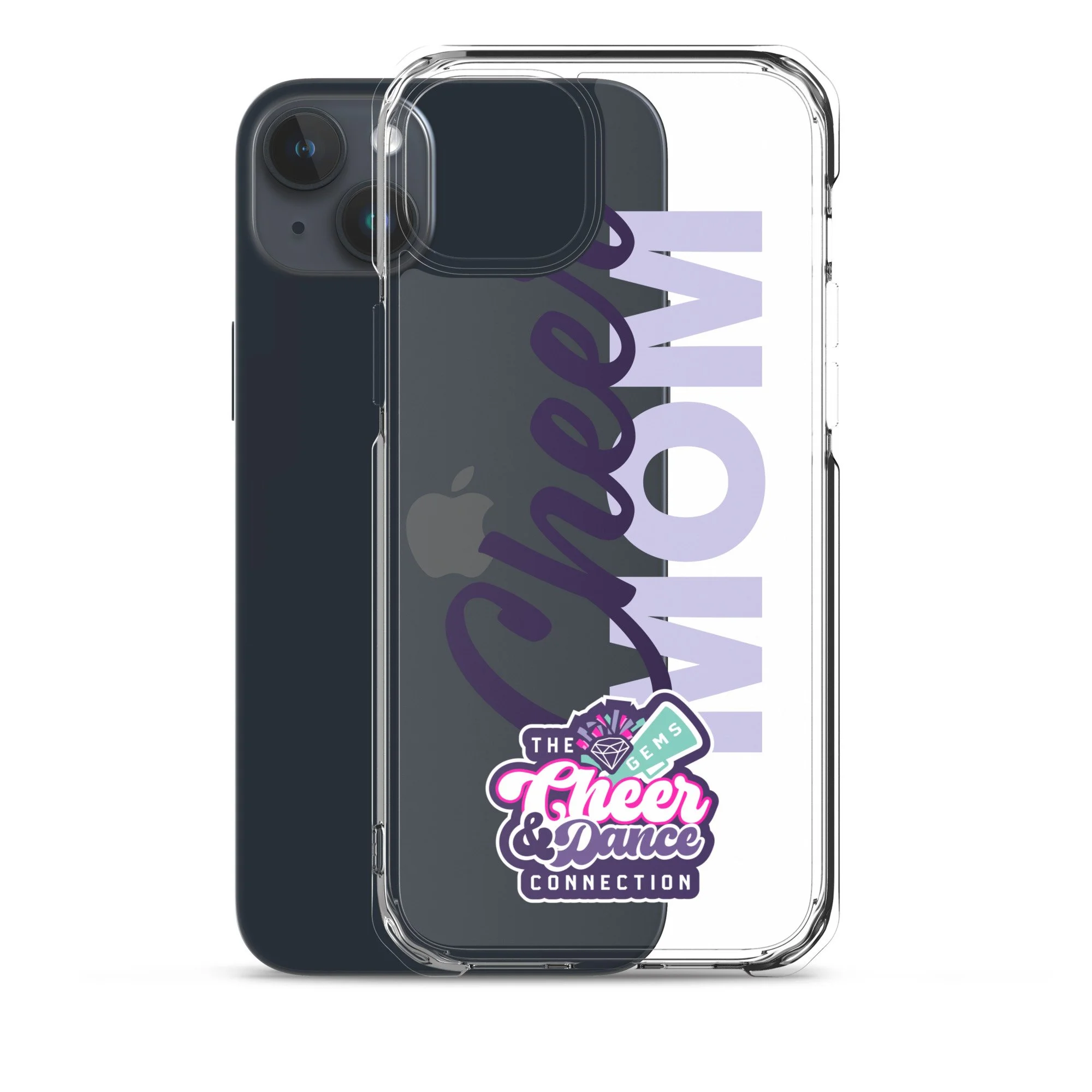 White hooded sweatshirt with purple and black text saying "Cheer MOM" and a smaller logo above that reads "Cheer & Dance Connection."